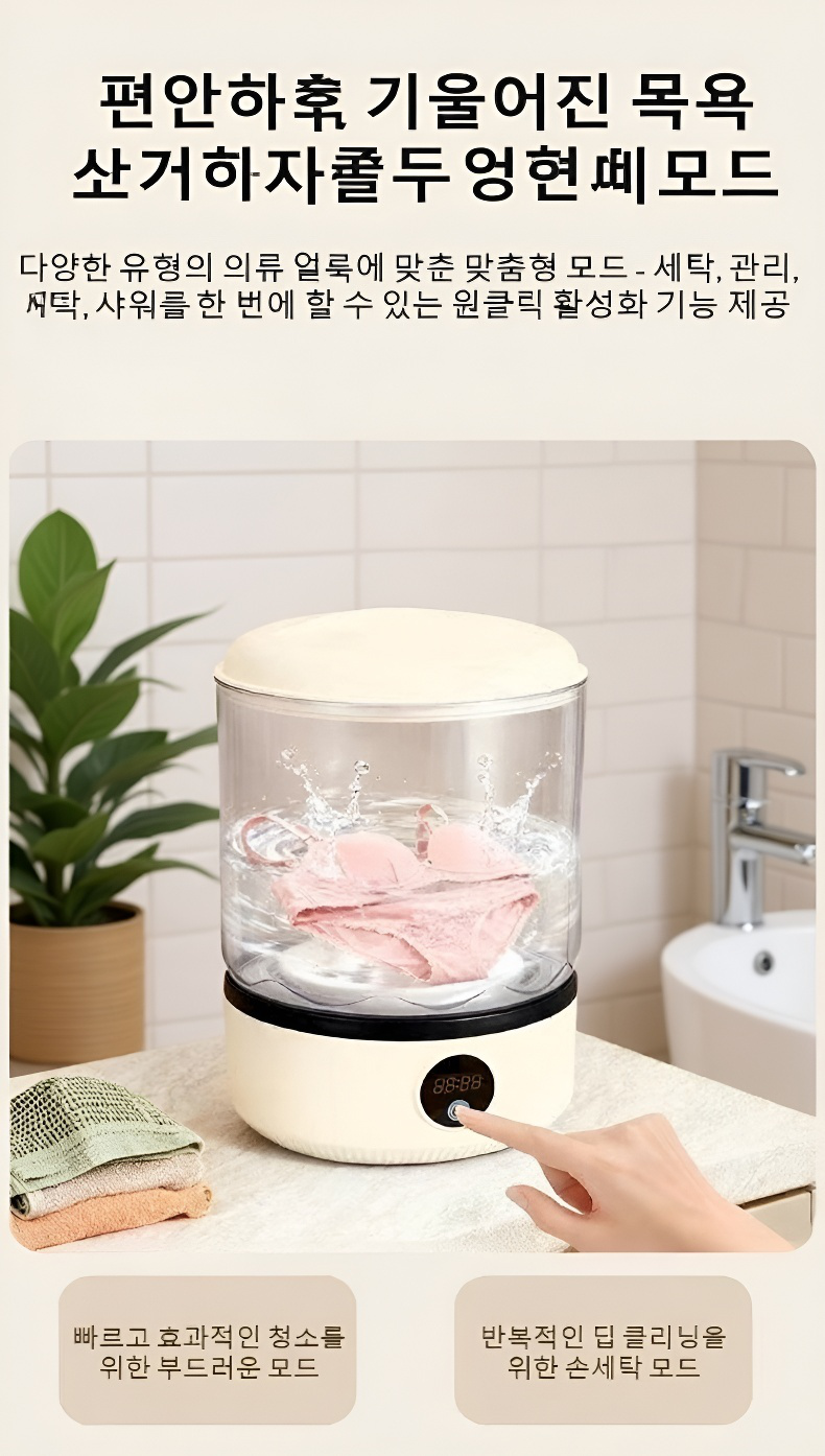 ● 완전 자동 손세탁 기능으로 힘들이지 않고 손쉽게 세탁이 가능하여 바쁜 일상에서도 청결을 유지할 수 있습니다. ● 충전식 디자인으로 전기선 없이 자유롭게 사용 가능하며, 캠핑이나 여행 등 야외에서도 편리하게 사용할 수 있습니다. ● 소형 경량 사이즈로 공간을 많이 차지하지 않아 자취생이나 1인 가구, 작은 공간에서도 효율적으로 활용할 수 있습니다. ● 저소음 모터와 강력한 세척력으로 옷감 손상 없이 깨끗하게 세탁할 수 있어 민감한 의류에도 적합합니다. ● 사용이 간편한 원터치 버튼과 다양한 세탁 모드 지원으로 누구나 쉽게 사용할 수 있으며, 세탁 시간을 절약할 수 있습니다.